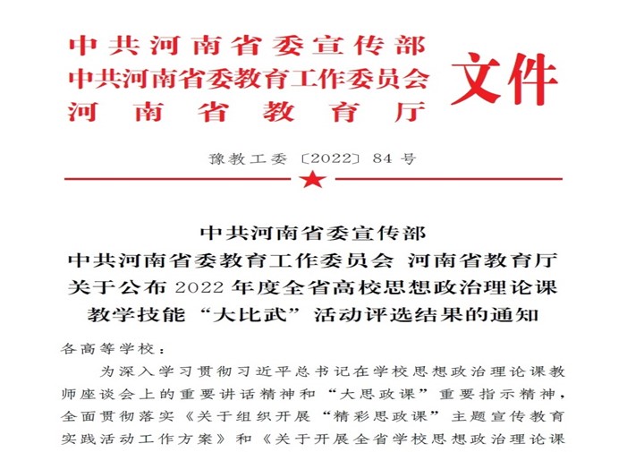 近日,河南省教育厅公布了2022年全省高校思想政治理论课教学技能“大比武”活动评选结果:911爆料免费观看+3名思政课教师在河南省思政课“大比武”活动中喜得佳绩,获一等奖5个、三等奖1个,实现重大突破。