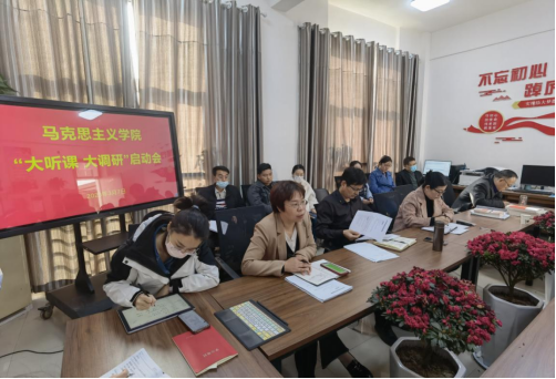 范文婷传达了《中共河南省委教育工委办公室河南省教育厅办公室关于开展2023年度全省高校春季学期思政课“大听课 大调研”活动的通知》,调研组将主要采取听、查、谈、议等方式,对 “习近平新时代中国特色社会主义思想概论”课的开设情况、《关于上好高校思政课指导意见》的贯彻情况、各门思政课程《教学要点及参考资料》 使用情况及意见建议等情况开展调研。