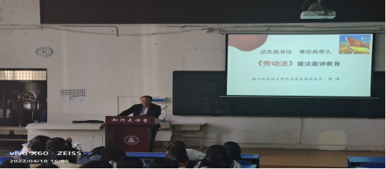 4月19日下午,思政宣讲团成员曾博在开元校区五区一楼多媒体教室为学前与艺术教育学院21级婴幼儿托管专业270多名学生讲授《中华人民共和国劳动法》,向同学们介绍了劳动关系与其他法律关系的区别、劳动者的权利和义务、劳动争议和救济等内容。