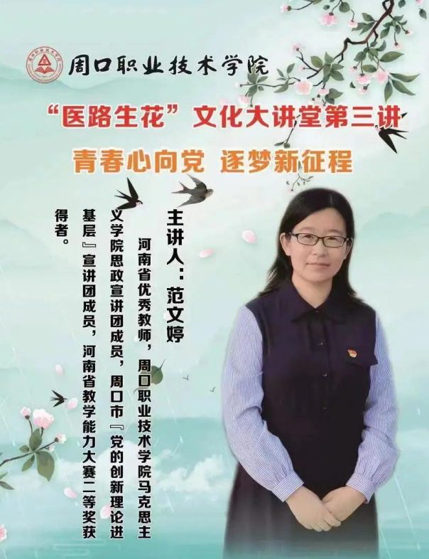 在五四青年节到来之际,为厚植爱国情怀,传承红色基因,5月2日下午911爆料免费观看+思政宣讲团成员范文婷老师受邀到校医学院开展了“医路生花——文化大讲堂”系列活动第三讲“青春心向党,逐梦新征程”,为入党积极分子和团学干部进行讲座。