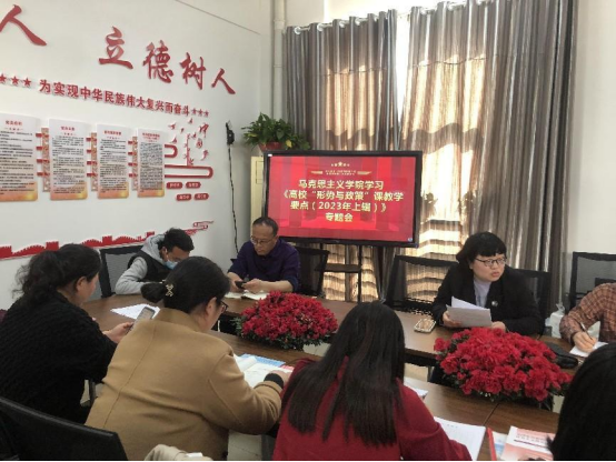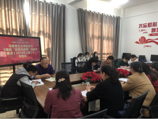 形势与政策教研室主任栗苏老师,领学《高校“形势与政策”课教学要点(2023年上辑)》,并表示“形势与政策”课是高校思想政治理论必修课,同时也是高校思想政治理论课的重要组成部分,是对学生进行形势与政策教育的主渠道和主阵地,在大学生思想政治教育中担负着重要使命,有利于引导学生正确认识国际国内形势,正确理解党和国家方针政策,我们任课教师应积极主动将党的二十大精神融入其中,更好推进专题教学的大思政课建设。
